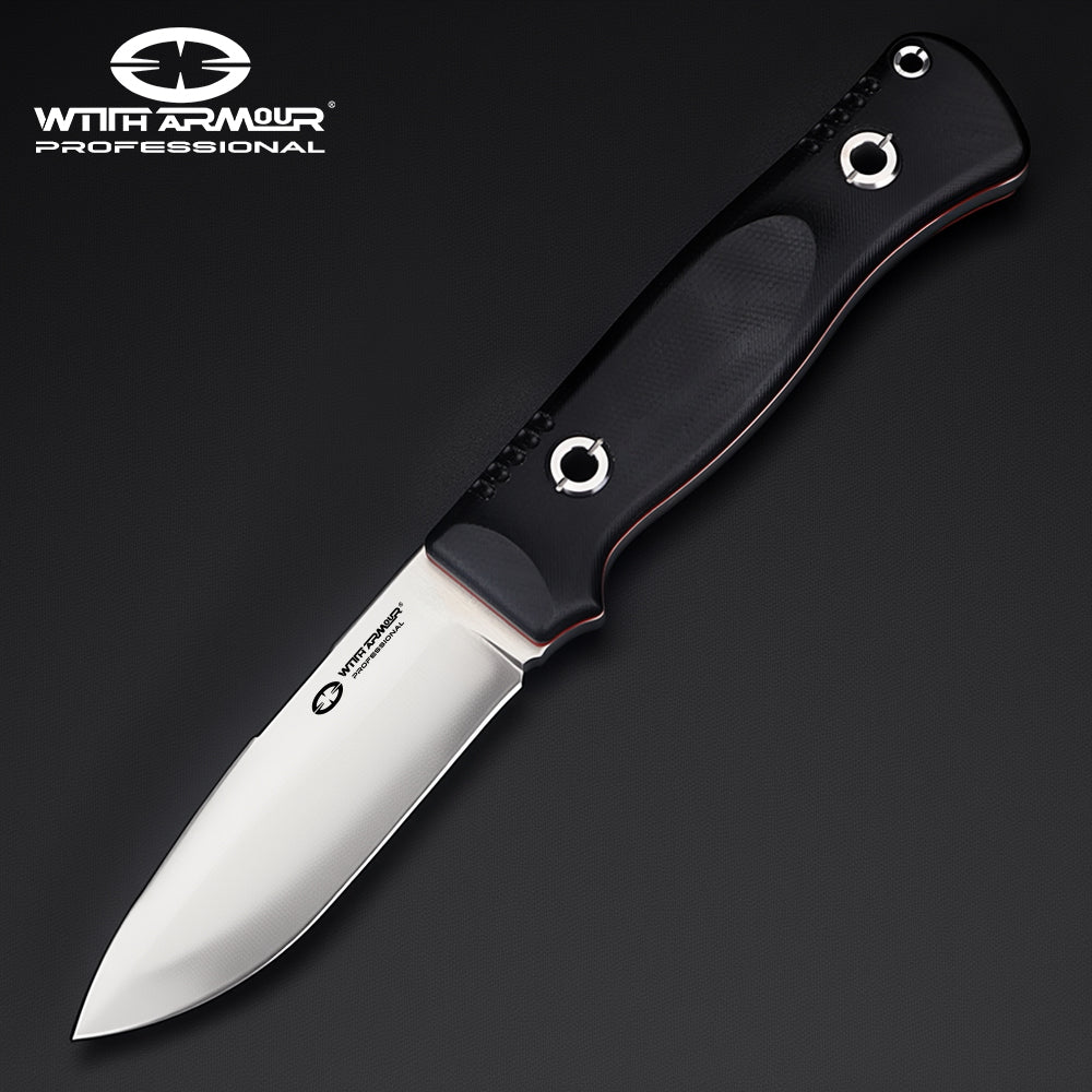 The blade is forged from VG10 steel, with a smooth surface and precise 45-degree bevels that reflect the meticulous attention to detail. Each curve along the blade has been masterfully refined with a one-third water grind, and after vacuum heat treatment, it reaches a hardness of 58-60HRC, making it capable of effortlessly tackling any challenge. With a thickness of 6mm and a length of 100.7mm, it is your reliable companion, whether in deep forest hunting or wilderness survival. The handle, crafted from black fine-grain micarta and red G10, is sculpted to perfection through CNC technology. The contrast between black and red not only gives it a distinctive appearance but also hints at its inherent strength and passion. The semi-circular metal accents around the handle emphasize structural integrity, ensuring a solid and dependable grip every time.